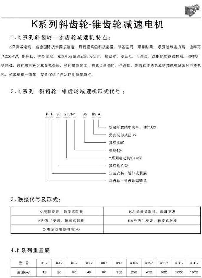 K系列斜齒輪-錐齒輪減速機特點型號表示法聯(lián)結(jié)代號及形式重量表